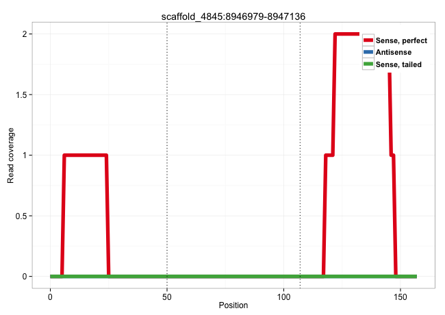 | CCTATCCTGATCCCCGAGAGATTGCTAATCCGCAGCCCCAGCCACTGGCAGTAAGTCATTGGGAAACTTTTCACTTGGAGCCCAGTTTAATAAGCTATTTTTCTTAGTATGCTCCCAATTTCGATGTGCCCCTGCACCGAGTGCGTCGCCAGCTGCA .........................................................((((((...((........))..))))))....................................................................... ..................................................51......................................................107................................................ | Size | Perfect hit | Total Norm | Perfect Norm | V108 | V040 |