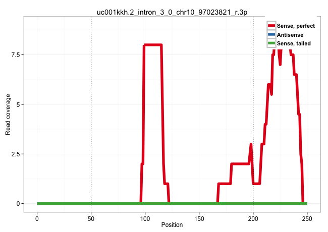| AGGTGCCCATTGTGGGAAACTTCCCCAGTCATTGCCCGTGTGTCTCAGTGGGTGTGTCAGTGTCCCTCAGCTAAAGTTTGGGTTGAACTAGGGCCATCTTAGCAGCTGGAACACCTCTCCCTGGCGCTCAGCCTGCACTGCCCATCAAGGGGTTTGCATTGGATGCCCCCCTTGATTTCTCCTCTGATCCCTGCCTGCAGGAGGTCCTGCACATAGGAAGCGCCCACAACCGAAGTGCCATGCCCTTTAC .....................................................................................................(((((.(((.((.........(((.....)))..........(((((((((...((((...)))).)))))))))........)).)))..)).))).................................................... ..............................................................................................95.......................................................................................................200................................................ | Size | Perfect hit | Total Norm | Perfect Norm | SRR094129(GSM651905) small RNA(18-35nt)small RNA deep sequencing o. (uterus) | SRR094131(GSM651907) small RNA(18-35nt)small RNA deep sequencing o. (uterus) | SRR094130(GSM651906) small RNA(18-35nt)small RNA deep sequencing o. (uterus) | SRR094132(GSM651908) small RNA(18-35nt)small RNA deep sequencing o. (uterus) | SRR189782 | SRR039622(GSM531985) HCV(+) Adjacent Tissue Sample. (liver) | SRR330868(SRX091706) tissue: skin psoriatic involveddisease state:. (skin) | SRR342901(SRX096797) small RNA seq of Left atrial tissue. (heart) | SRR039623(GSM531986) HCV(+) HCC Tissue Sample. (liver) | SRR330867(SRX091705) tissue: skin psoriatic involveddisease state:. (skin) | SRR330883(SRX091721) tissue: skin psoriatic uninvolveddisease stat. (skin) | DRR000556(DRX000314) "THP-1 whole cell RNA, after 3 day treatment . (cell line) | DRR000558(DRX000316) "THP-1 whole cell RNA, after 3 day treatment . (cell line) | SRR207118(GSM721080) RRP40 knockdown. (RRP40 cell line) | SRR033715(GSM497060) Mantle Cell Lymphoma (Mino122). (B cell) | GSM956925Ago2D5(GSM956925) "cell line: HEK293 cell linepassages: 15-20ip. (ago2 cell line) | SRR207115(GSM721077) XRN1&2 knockdown. (XRN1/XRN2 cell line) | SRR342895(SRX096791) small RNA seq of Left atrial tissue. (heart) | SRR342899(SRX096795) small RNA seq of Left atrial tissue. (heart) | SRR191605(GSM715715) 76genomic small RNA (size selected RNA from t. (breast) | SRR040043(GSM532928) G428T. (cervix) | SRR342897(SRX096793) small RNA seq of Left atrial tissue. (heart) |