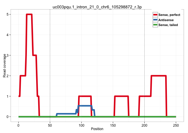 | CAGGAGAATTGCTTGAACCAGGGAGGTGGAGGTTGCAGTGAGCCAAGATCTCGCCACTGTACTCCAGCCTGGTGACAGAGCAAGACTCTTGTCTCAACAAACAAACAAACAAACAGAGCAGCTAAAGAGTTGTTAACTTGATTTATTATGTTTTTAAAAACTTTTTTTACACTTGATTCCTCATTTTTATTTTGGCATAGGTCTGTTTCTGAACTACTATCAAATTCAAAATTTGATGTCAATTATGCAT ..................................................................(((((....))).)).((((....))))....(((((((.((((((....(((((((....)))))))...))).))).)).)))))................................................................................................. ................................................................65................................................................................................163..................................................................................... | Size | Perfect hit | Total Norm | Perfect Norm | SRR553572(SRX182778) source: Frontal Cortex. (Frontal Cortex) | SRR189780(GSM714640) cell line: HEK293clip variant: PAR-CLIPenzyma. (cell line) | SRR189779(GSM714639) cell line: HEK293clip variant: PAR-CLIPenzyma. (cell line) | SRR314796(SRX084354) "Total RNA, fractionated (15-30nt)". (cell line) | SRR553573(SRX182779) source: Cerebellum. (Cerebellum) | DRR000555(DRX000313) "THP-1 whole cell RNA, no treatment". (cell line) | SRR330889(SRX091727) tissue: skin psoriatic uninvolveddisease stat. (skin) | SRR189782 | SRR330859(SRX091697) tissue: skin psoriatic involveddisease state:. (skin) | SRR330879(SRX091717) tissue: skin psoriatic involveddisease state:. (skin) | SRR040029(GSM532914) G026T. (cervix) | GSM450601(GSM450601) miRNA sequencing raw reads from post-mortem s. (brain) | SRR207113(GSM721075) IP against AGO 1 & 2. (ago1/2 cell line) | DRR000557(DRX000315) "THP-1 whole cell RNA, after 3 day treatment . (cell line) | SRR330890(SRX091728) tissue: skin psoriatic uninvolveddisease stat. (skin) | GSM1105753INPUT(GSM1105753) small RNA sequencing data. (hela) | DRR000558(DRX000316) "THP-1 whole cell RNA, after 3 day treatment . (cell line) | DRR000559(DRX000317) "THP-1 whole cell RNA, no treatment". (cell line) | TAX577579(Rovira) total RNA. (breast) | SRR330860(SRX091698) tissue: skin psoriatic involveddisease state:. (skin) | SRR107296(GSM677703) 18-30nt fraction of small RNA. (cell line) | GSM532879(GSM532879) G659N. (cervix) | SRR342897(SRX096793) small RNA seq of Left atrial tissue. (heart) | GSM956925Ago2PAZ(GSM956925) "cell line: HEK293 cell linepassages: 15-20ip. (ago2 cell line) | SRR330878(SRX091716) tissue: skin psoriatic involveddisease state:. (skin) | SRR189778(GSM714638) cell line: HEK293clip variant: PAR-CLIPenzyma. (cell line) | SRR060981(GSM569185) Human centroblast [09-001]. (cell line) | SRR189781(GSM714641) cell line: HEK293clip variant: PAR-CLIPenzyma. (cell line) |