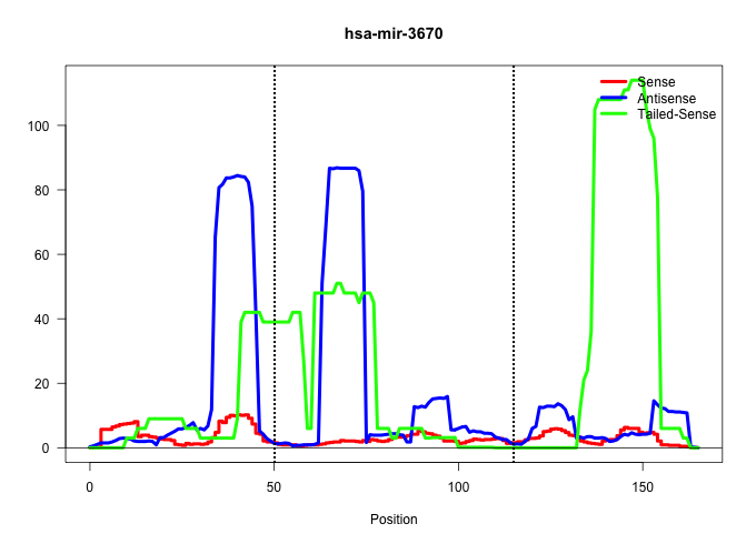 | TGTTATGAAAATCATCCCTGCCTAGAGATGAATTCCCCCTTCCCCTGAGGTCTAGACTGGTATAGCTGCTTTTGGAGCCTCACCTGCTGAGAGCTCACAGCTGTCCTTCTCTAGAGAATCACCCTCAGATGGGAGCCACATTGCCTGGGATGGGATGCCATGCCC ..................................................((((((..((.(((((((......((((((((.....)))).)))).)))))))))...)))))).................................................. ..................................................51..............................................................115................................................ | Size | Perfect hit | Total Norm | Perfect Norm | SRR040029(GSM532914) G026T. (cervix) | TAX577740(Rovira) total RNA. (breast) | SRR040008(GSM532893) G727N. (cervix) | SRR342899(SRX096795) small RNA seq of Left atrial tissue. (heart) | SRR040018(GSM532903) G701N. (cervix) | SRR040040(GSM532925) G612N. (cervix) | SRR094129(GSM651905) small RNA(18-35nt)small RNA deep sequencing o. (uterus) | SRR037876(GSM522374) fibroblasts_cell_culture. (fibroblast) | SRR037937(GSM510475) 293cand2. (cell line) | SRR330868(SRX091706) tissue: skin psoriatic involveddisease state:. (skin) | TAX577743(Rovira) total RNA. (breast) | SRR039192(GSM494811) K562 cell line is derived from a CML patient . (cell line) | SRR330886(SRX091724) tissue: skin psoriatic uninvolveddisease stat. (skin) | SRR139203(SRX050636) FLASHPage purified small RNA (~15-40nt) from . (spleen) | SRR139217(SRX050633) FLASHPage purified small RNA (~15-40nt) from . (thymus) |