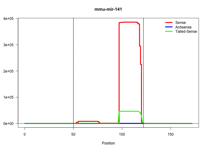 | TTCCCTCTAGCGCTTGATCAGCGGTAGATCAATTTATATTGGCTGGCTCTGGGTCCATCTTCCAGTGCAGTGTTGGATGGTTGAAGTATGAAGCTCCTAACACTGTCTGGTAAAGATGGCCCCCGGGTCAGTTCCTTCAGCAGTGACCTTGGAGCCTTGAAGACCACCTAGG ....................................................(((.(((((((((((.((((((((((..((((.........)))).))))))))))))))..)))))))))).................................................. ..................................................51.......................................................................124................................................ | Size | Perfect hit | Total Norm | Perfect Norm | SRR279904(GSM689054) cell type: mouse embryonic stem cellcell line. (ESC) | SRR391853(GSM852148) gender: femalegenotype/variation: ADAR2-/-/AD. (embryo) | SRR391852(GSM852147) gender: femalegenotype/variation: ADAR2-/-tis. (embryo) | SRR279903(GSM689053) cell type: mouse embryonic stem cellcell line. (ESC) | SRR391851(GSM852146) gender: femalegenotype/variation: wild typeti. (embryo) | Ago1IP517(Rui) Quantitative functions of Argonaute proteins . (ago1 skin) | Ago1IP812(Rui) Quantitative functions of Argonaute proteins . (ago1 skin) | Ago2IP504(Rui) Quantitative functions of Argonaute proteins . (ago2 skin) | Ago3IP812(Rui) Quantitative functions of Argonaute proteins . (ago3 skin) | Ago3IP805(Rui) Quantitative functions of Argonaute proteins . (ago3 skin) | Ago2IP517(Rui) Quantitative functions of Argonaute proteins . (ago2 skin) | SRR279907(GSM689057) cell type: mouse embryonic stem cellcell line. (ESC) | GSM510456(GSM510456) newborn_rep12. (total RNA) | SRR402762(SRX117945) source: ES E14 male cells. (ESC) | SRR116846(GSM678422) Small RNA deep sequencing from mouse epididym. (blood) | RuiDGCR8WT(Rui) DGCR8-dependent microRNA biogenesis is essent. (skin) | RuiDcrWT(Rui) DGCR8-dependent microRNA biogenesis is essent. (skin) | SRR402760(SRX117943) source: ES E14 male cells. (ESC) | SRR279906(GSM689056) cell type: mouse embryonic stem cellcell line. (ESC) | SRR391846(GSM852141) gender: femalegenotype/variation: ADAR2-/-tis. (embryo) | SRR037914(GSM510451) newborn_rep7. (total RNA) | GSM314552(GSM314552) ESC wild type (Illumina). (ESC) | SRR279905(GSM689055) cell type: mouse embryonic stem cellcell line. (ESC) | SRR037912(GSM510449) newborn_rep5. (total RNA) | SRR391845(GSM852140) gender: femalegenotype/variation: wild typeti. (embryo) | SRR391847(GSM852142) gender: femalegenotype/variation: ADAR2-/-/AD. (embryo) | GSM510453(GSM510453) newborn_rep9. (total RNA) | SRR391848(GSM852143) gender: femalegenotype/variation: wild typeti. (embryo) | GSM510452(GSM510452) newborn_rep8. (total RNA) | GSM510455(GSM510455) newborn_rep11. (total RNA) | GSM510454(GSM510454) newborn_rep10. (total RNA) | SRR402761(SRX117944) source: ES E14 male cells. (ESC) | SRR037897(GSM510433) ovary_rep2. (ovary) | GSM510450(GSM510450) newborn_rep6. (total RNA) | mjTestesWT1() Testes Data. (testes) | SRR037898(GSM510434) ovary_rep3. (ovary) | SRR306539(GSM750582) 19-24nt. (ago2 brain) | SRR065052(SRR065052) Tissue-specific Regulation of Mouse MicroRNA . (jejunum) | SRR065053(SRR065053) Tissue-specific Regulation of Mouse MicroRNA . (jejunum) | SRR402766(SRX117949) source: ES PGK female cells. (ESC) | GSM261959(GSM261959) oocytesmallRNA-19to30. (oocyte) | SRR077866(GSM637803) 18-30 nt small RNAs. (liver) | SRR391849(GSM852144) gender: femalegenotype/variation: ADAR2-/-tis. (embryo) | SRR065054(SRR065054) Tissue-specific Regulation of Mouse MicroRNA . (jejunum) | SRR065056(SRR065056) Tissue-specific Regulation of Mouse MicroRNA . (jejunum) | GSM314558(GSM314558) ESC wild type (454). (ESC) | SRR023851(GSM307160) ZHBT-c412hsmallrna_rep1. (cell line) | SRR391850(GSM852145) gender: femalegenotype/variation: ADAR2-/-/AD. (embryo) | SRR023852(GSM307161) ZHBT-c424hsmallrna_rep1. (cell line) | SRR037909(GSM510446) newborn_rep2. (total RNA) | SRR037937(GSM510475) 293cand2. (cell line) | GSM261957(GSM261957) oocytesmallRNA-19to24. (oocyte) | SRR037910(GSM510447) newborn_rep3. (total RNA) | SRR065055(SRR065055) Tissue-specific Regulation of Mouse MicroRNA . (jejunum) | SRR065058(SRR065058) Tissue-specific Regulation of Mouse MicroRNA . (pancreas) | SRR037929(GSM510467) e7p5_rep3. (embryo) | SRR023850(GSM307159) ZHBT-c40hsmallrna_rep1. (cell line) | SRR065059(SRR065059) Tissue-specific Regulation of Mouse MicroRNA . (pancreas) | SRR037921(GSM510459) e12p5_rep3. (embryo) | SRR023847(GSM307156) mESv6.5smallrna_rep1. (cell line) | SRR037928(GSM510466) e7p5_rep2. (embryo) | SRR037944(GSM510482) 293DcrTN_cand5. (cell line) | SRR037943(GSM510481) 293DcrTN. (cell line) | SRR037925(GSM510463) e9p5_rep3. (embryo) | SRR037924(GSM510462) e9p5_rep2. (embryo) | SRR206941(GSM723282) other. (brain) | SRR037899(GSM510435) ovary_rep4. (ovary) | SRR037941(GSM510479) 293DroshaTN. (cell line) | SRR077864(GSM637801) 18-30 nt small RNAs. (liver) | SRR040489(GSM533912) E18.5 Ago2 catalytically inactive LIVER small RNA. (liver) | SRR037940(GSM510478) 293cand5_rep2. (cell line) | SRR042484(GSM539876) mouse salivary gland tissue [09-002]. (gland) | SRR037920(GSM510458) e12p5_rep2. (embryo) | SRR059768(GSM562830) Treg_control. (spleen) | SRR037942(GSM510480) 293DroshaTN_cand5. (cell line) | mjTestesKO8() Testes Data. (Zcchc11 testes) | SRR206942(GSM723283) other. (brain) | SRR059765(GSM562827) DN3_control. (thymus) | SRR059770(GSM562832) Treg_Dicer. (spleen) | SRR037939(GSM510477) 293cand5_rep1. (cell line) | SRR029043(GSM433295) 18.5dpc_homo_tdrd1-KO. (tdrd1 testes) | GSM510444(GSM510444) brain_rep5. (brain) | SRR248523(GSM733811) cell type: Thy1+ spermatogonial stem cellstra. (testes) | SRR042481(GSM539873) mouse pancreatic tissue [09-002]. (pancreas) | SRR014237(GSM319961) 10 dpp MILI-KO total. (mili testes) | SRR248524(GSM733812) cell type: Thy1+ spermatogonial stem cellstra. (testes) | SRR037911(GSM510448) newborn_rep4. (total RNA) | SRR059767(GSM562829) DN3_Dicer. (thymus) | SRR306536(GSM750579) 19-24nt. (ago2 brain) | SRR037938(GSM510476) 293Red. (cell line) | mjLiverKO3() Liver Data. (Zcc