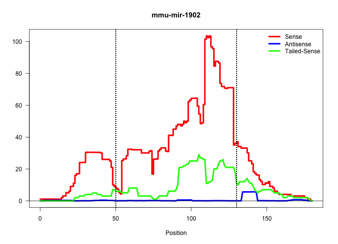 | CACAGCACAGCATTTTATATACTATTAAGTGAAACTGCAATACAACCTAAGTTTATTTTGGGAGTGTTTGCTGTATAATTGGACTTGATAAAATGTTTAGAGGTGCAGTAGGCATGACTTGAGTAGATAATGAGAGGAAATGCAAGTGCTCATCGACTCATGATGTGCGCCCTCCTTGCT .............................................................(((((((((((((..((((((..........))))))..))))))))))))).................................................... ....................................................53..............................................................117............................................................. | Size | Perfect hit | Total Norm | Perfect Norm | SRR391852(GSM852147) gender: femalegenotype/variation: ADAR2-/-tis. (embryo) | mjLiverKO2() Liver Data. (Zcchc11 liver) | SRR028732(GSM400969) Mili-Tdrd1 KO associated. (mili testes) | SRR391853(GSM852148) gender: femalegenotype/variation: ADAR2-/-/AD. (embryo) | SRR042454(GSM539846) mouse germinal center B cells (lymph node) [09-002]. (b cell) | SRR391846(GSM852141) gender: femalegenotype/variation: ADAR2-/-tis. (embryo) | SRR391845(GSM852140) gender: femalegenotype/variation: wild typeti. (embryo) | SRR391851(GSM852146) gender: femalegenotype/variation: wild typeti. (embryo) | SRR363959(GSM822761) AdultSmall RNA Miwi IPread_length: 36. (testes) | SRR391847(GSM852142) gender: femalegenotype/variation: ADAR2-/-/AD. (embryo) | SRR391849(GSM852144) gender: femalegenotype/variation: ADAR2-/-tis. (embryo) | SRR034119(GSM466729) Mili IP_Tdrd9+/- replicate2. (mili testes) | SRR040489(GSM533912) E18.5 Ago2 catalytically inactive LIVER small RNA. (liver) | SRR034118(GSM466728) Mili IP_Tdrd9+/- replicate1. (mili testes) | SRR391848(GSM852143) gender: femalegenotype/variation: wild typeti. (embryo) | SRR040488(GSM533911) E18.5 wild type LIVER small RNA. (liver) | SRR363960(GSM822762) Adult Library#1Small RNA Miwi IPDuplexed run:. (testes) | GSM475280(GSM475280) Mili-IP. (mili testes) | SRR248523(GSM733811) cell type: Thy1+ spermatogonial stem cellstra. (testes) | SRR248526(GSM733814) cell type: Thy1- spermatogonial stem cellstra. (testes) | SRR039154(GSM471931) HL1_siSrf2_smallRNAseq. (muscle) | SRR279905(GSM689055) cell type: mouse embryonic stem cellcell line. (ESC) | SRR039610(GSM527274) small RNA-Seq. (brain) | SRR029040(GSM433292) 6w_hetero_tdrd6-KO. (tdrd6 testes) | SRR042469(GSM539861) mouse Th2 cells [09-002]. (lymph) | SRR345203(SRX097264) source: size fractionated RNA from mouse hipp. (brain) | SRR042472(GSM539864) mouse iTreg cells [09-002]. (lymph) | SRR306541(GSM750584) 19-24nt. (ago2 brain) | mjTestesKO7() Testes Data. (Zcchc11 testes) | SRR037927(GSM510465) e7p5_rep1. (embryo) | SRR042448(GSM539840) mouse B cells activated in vitro with LPS/IL4 replicate 1 [09-002]. (b cell) | SRR042458(GSM539850) mouse basophil cells [09-002]. (b cell) | SRR042488(GSM539880) mouse BclXL germinal center B cells [BalbC] [09-002]. (B cell) | SRR051939(GSM545783) Mov10L1-associated piRNAs. (testes) | GSM509276(GSM509276) small RNA cloning by length. (testes) | GSM519104(GSM519104) mouse_granulocyte_nuclei_smallRNAs. (cell line) | GSM475279(GSM475279) Miwi-IP. (miwi testes) | SRR059769(GSM562831) Treg_Drosha. (spleen) | SRR345197(SRX097258) source: size fractionated RNA from mouse hipp. (brain) | SRR059767(GSM562829) DN3_Dicer. (thymus) | SRR037928(GSM510466) e7p5_rep2. (embryo) | SRR038742(GSM527277) small RNA-Seq. (dgcr8 brain) | SRR034120(GSM466730) Mili IP_Tdrd9-/- replicate1. (mili testes) | mjTestesKO8() Testes Data. (Zcchc11 testes) | GSM510453(GSM510453) newborn_rep9. (total RNA) | SRR042466(GSM539858) mouse CD8+ T cells (spleen) [09-002]. (spleen) | SRR065053(SRR065053) Tissue-specific Regulation of Mouse MicroRNA . (jejunum) | SRR014231(GSM319955) 16.5 dpc total. (testes) | SRR028730(GSM400967) Tdrd1-associated. (tdrd1 testes) | SRR042445(GSM539837) mouse immature B cells [09-002]. (b cell) | SRR029037(GSM433289) 18dpp_homo_tdrd6-KO. (tdrd6 testes) | SRR042455(GSM539847) mouse plasma cells [09-002]. (blood) | SRR065052(SRR065052) Tissue-specific Regulation of Mouse MicroRNA . (jejunum) | SRR206940(GSM723281) other. (brain) | SRR248527(GSM733815) cell type: spermatogonial stem cell enriched . (testes) | SRR014235(GSM319959) 2 dpp total. (testes) | SRR042450(GSM539842) mouse B cells activated in vitro with LPS/IL4 replicate 3 [09-002]. (b cell) | SRR248525(GSM733813) cell type: Thy1- spermatogonial stem cellstra. (testes) | mjTestesKO5() Testes Data. (Zcchc11 testes) | SRR248524(GSM733812) cell type: Thy1+ spermatogonial stem cellstra. (testes) | SRR042449(GSM539841) mouse B cells activated in vitro with LPS/IL4 replicate 2 [09-002]. (b cell) | SRR029038(GSM433290) 25dpp_hetero_tdrd6-KO. (tdrd6 testes) | SRR037937(GSM510475) 293cand2. (cell line) | SRR042459(GSM539851) mouse neutrophil cells replicate 1 [09-002]. (blood) | GSM475281(GSM475281) total RNA. (testes) | SRR039152(GSM471929) HL1_siNon_smallRNAseq. (muscle) | SRR038740(GSM527275) small RNA-Seq. (dicer brain) | SRR023847(GSM307156) mESv6.5smallrna_rep1. (cell line) | SRR402762(SRX117945) source: ES E14 male cells. (ESC) |