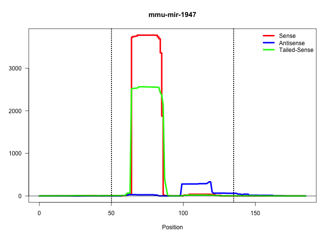 | GGATGCTCTGCTTTTAAGAAAGACAATTAGATTTGTGGCATCTGAAAGATGAACAAGGTGGTGGAGGACGAGCTAGCTGAGTGCTGCAGACACTCTAAGAGCACTGAGCTAGCTCTCCCTCCATGCCCTGCTCAATCGTGAAGTTCCGACGTGTGCCTGACCTCACAGAGTATCAGAGCCCATCA ...................................................(((((((..(((((((((.((((((..((.....))...)))))).)))))))))..)))))))........................................................ ...........................................................60....................................................................130..................................................... | Size | Perfect hit | Total Norm | Perfect Norm | SRR037940(GSM510478) 293cand5_rep2. (cell line) | SRR037939(GSM510477) 293cand5_rep1. (cell line) | SRR037944(GSM510482) 293DcrTN_cand5. (cell line) | SRR279907(GSM689057) cell type: mouse embryonic stem cellcell line. (ESC) | SRR069809(GSM610965) small RNA sequencing; sample 1. (testes) | mjTestesWT3() Testes Data. (testes) | SRR037933(GSM510471) 293cand4_rep2. (cell line) | SRR037934(GSM510472) 293cand4_rep3. (cell line) | SRR345202(SRX097263) source: size fractionated RNA from mouse hipp. (brain) | SRR402762(SRX117945) source: ES E14 male cells. (ESC) | SRR065054(SRR065054) Tissue-specific Regulation of Mouse MicroRNA . (jejunum) | SRR391848(GSM852143) gender: femalegenotype/variation: wild typeti. (embryo) | mjTestesWT1() Testes Data. (testes) | SRR391851(GSM852146) gender: femalegenotype/variation: wild typeti. (embryo) | SRR037942(GSM510480) 293DroshaTN_cand5. (cell line) | SRR391852(GSM852147) gender: femalegenotype/variation: ADAR2-/-tis. (embryo) | SRR345204(SRX097265) source: size fractionated RNA from mouse hipp. (brain) | SRR345207(SRX097268) source: size fractionated RNA from mouse hipp. (brain) | SRR042459(GSM539851) mouse neutrophil cells replicate 1 [09-002]. (blood) | SRR345203(SRX097264) source: size fractionated RNA from mouse hipp. (brain) | SRR248526(GSM733814) cell type: Thy1- spermatogonial stem cellstra. (testes) | mjTestesWT4() Testes Data. (testes) | SRR065053(SRR065053) Tissue-specific Regulation of Mouse MicroRNA . (jejunum) | SRR345198(SRX097259) source: size fractionated RNA from mouse hipp. (brain) | SRR065055(SRR065055) Tissue-specific Regulation of Mouse MicroRNA . (jejunum) | SRR065052(SRR065052) Tissue-specific Regulation of Mouse MicroRNA . (jejunum) | SRR042470(GSM539862) mouse Th17 cells [09-002]. (lymph) | SRR042471(GSM539863) mouse TFHS cells [09-002]. (spleen) | SRR042443(GSM539835) mouse pro B cells [09-002]. (b cell) | SRR345205(SRX097266) source: size fractionated RNA from mouse hipp. (brain) | mjLiverWT3() Liver Data. (liver) | mjLiverWT1() Liver Data. (liver) | SRR042488(GSM539880) mouse BclXL germinal center B cells [BalbC] [09-002]. (B cell) | SRR042480(GSM539872) mouse kidney tissue [09-002]. (kidney) | SRR248525(GSM733813) cell type: Thy1- spermatogonial stem cellstra. (testes) | mjLiverKO2() Liver Data. (Zcchc11 liver) | SRR042467(GSM539859) mouse T cells activated in vitro with Concanavalin A [09-002]. (spleen) | mjTestesWT2() Testes Data. (testes) | SRR069811(GSM610967) small RNA sequencing; sample 3. (testes) | SRR042469(GSM539861) mouse Th2 cells [09-002]. (lymph) | SRR391853(GSM852148) gender: femalegenotype/variation: ADAR2-/-/AD. (embryo) | SRR390300(GSM849858) cell line: NIH-3T3cell type: fibroblastinfect. (ago2 fibroblast) | SRR402761(SRX117944) source: ES E14 male cells. (ESC) | SRR037932(GSM510470) 293cand4_rep1. (cell line) | SRR042466(GSM539858) mouse CD8+ T cells (spleen) [09-002]. (spleen) | SRR042474(GSM539866) mouse embryonic stem cells [09-002]. (ESC) | SRR042454(GSM539846) mouse germinal center B cells (lymph node) [09-002]. (b cell) | SRR042477(GSM539869) mouse brain tissue [09-002]. (brain) | SRR391849(GSM852144) gender: femalegenotype/variation: ADAR2-/-tis. (embryo) | SRR042451(GSM539843) mouse B cells activated in vitro with LPS/aIgD-Dextran [09-002]. (b cell) | SRR345199(SRX097260) source: size fractionated RNA from mouse hipp. (brain) | SRR065059(SRR065059) Tissue-specific Regulation of Mouse MicroRNA . (pancreas) | SRR042468(GSM539860) mouse Th1 cells [09-002]. (lymph) | SRR039152(GSM471929) HL1_siNon_smallRNAseq. (muscle) | Ago2IP517(Rui) Quantitative functions of Argonaute proteins . (ago2 skin) | SRR042461(GSM539853) mouse dendritic cells [09-002]. (bone marrow) | SRR345201(SRX097262) source: size fractionated RNA from mouse hipp. (brain) | SRR065058(SRR065058) Tissue-specific Regulation of Mouse MicroRNA . (pancreas) | SRR039153(GSM471930) HL1_siSrf1_smallRNAseq. (muscle) | SRR039154(GSM471931) HL1_siSrf2_smallRNAseq. (muscle) | SRR391850(GSM852145) gender: femalegenotype/variation: ADAR2-/-/AD. (embryo) | SRR345197(SRX097258) source: size fractionated RNA from mouse hipp. (brain) | SRR279904(GSM689054) cell type: mouse embryonic stem cellcell line. (ESC) | SRR042456(GSM539848) mouse hematopoetic progenitor cells [09-002]. (bone marrow) | SRR060845(GSM561991) total RNA. (brain) | SRR391845(GSM852140) gender: femalegenotype/variation: wild typeti. (embryo) | SRR042444(GSM539836) mouse pre B cells [09-002]. (b cell) | SRR279903(GSM689053) cell type: mouse embryonic stem cellcell line. (ESC) | SRR042445(GSM539837) mouse immature B cells [09-002]. (b cell) | SRR042475(GSM539867) mouse embryonic fibroblast cells [09-002]. (fibroblast) | SRR042448(GSM539840) mouse B cells activated in vitro with LPS/IL4 replicate 1 [09-002]. (b cell) | SRR042458(GSM539850) mouse basophil cells [09-002]. (b cell) | SRR069810(GSM610966) small RNA sequencing; sample 2. (testes) | SRR391847(GSM852142) gender: femalegenotype/variation: ADAR2-/-/AD. (embryo) | mjLiverKO3() Liver Data. (Zcchc11 liver) | SRR042478(GSM539870) mouse lung tissue [09-002]. (lung) | SRR042447(GSM539839) mouse mature B cells (spleen) replicate 2 [09-002]. (b cell) | SRR042465(GSM539857) mouse CD4+ T cells (spleen) [09-002]. (spleen) | SRR345200(SRX097261) source: size fractionated RNA from mouse hipp. (brain) | SRR390297(GSM849855) cell line: NIH-3T3cell type: fibroblastip a