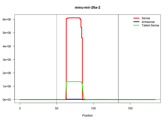 | GACCTACACAAGCCGTCCTGCTGGAATCCCGTACAGAAGGCTACTGTGGAGGCTGCGGCTGGATTCAAGTAATCCAGGATAGGCTGTGTCCGTCCATGAGGCCTGTTCTTGATTACTTGTTTCTGGAGGCAGCGCATGGTCTGCCCTCAATGAAGATGGCTCCTGGGAGTGCATTCCTTCCTGC ..........................................................(((((..(((((((((.(((((((((((((......)))..)))))))))).)))))))))..))))).......................................................... ..........................................................59..................................................................127....................................................... | Size | Perfect hit | Total Norm | Perfect Norm | SRR306540(GSM750583) 19-24nt. (ago2 brain) | SRR279904(GSM689054) cell type: mouse embryonic stem cellcell line. (ESC) | SRR306535(GSM750578) 19-24nt. (ago2 brain) | SRR391852(GSM852147) gender: femalegenotype/variation: ADAR2-/-tis. (embryo) | SRR279903(GSM689053) cell type: mouse embryonic stem cellcell line. (ESC) | SRR391853(GSM852148) gender: femalegenotype/variation: ADAR2-/-/AD. (embryo) | SRR391845(GSM852140) gender: femalegenotype/variation: wild typeti. (embryo) | SRR306532(GSM750575) 19-24nt. (ago2 brain) | SRR306534(GSM750577) 19-24nt. (ago2 brain) | SRR390298(GSM849856) cell line: NIH-3T3cell type: fibroblastinfect. (fibroblast) | SRR391851(GSM852146) gender: femalegenotype/variation: wild typeti. (embryo) | SRR306533(GSM750576) 19-24nt. (ago2 brain) | mjTestesKO8() Testes Data. (Zcchc11 testes) | SRR279906(GSM689056) cell type: mouse embryonic stem cellcell line. (ESC) | SRR390300(GSM849858) cell line: NIH-3T3cell type: fibroblastinfect. (ago2 fibroblast) | GSM510444(GSM510444) brain_rep5. (brain) | SRR306527(GSM750570) 19-24nt. (ago2 brain) | SRR402762(SRX117945) source: ES E14 male cells. (ESC) | SRR391846(GSM852141) gender: femalegenotype/variation: ADAR2-/-tis. (embryo) | SRR306542(GSM750585) 19-24nt. (ago2 brain) | SRR306536(GSM750579) 19-24nt. (ago2 brain) | SRR390299(GSM849857) cell line: NIH-3T3cell type: fibroblastip ant. (ago2 fibroblast) | SRR390297(GSM849855) cell line: NIH-3T3cell type: fibroblastip ant. (fibroblast) | SRR306537(GSM750580) 19-24nt. (ago2 brain) | SRR391847(GSM852142) gender: femalegenotype/variation: ADAR2-/-/AD. (embryo) | SRR306541(GSM750584) 19-24nt. (ago2 brain) | SRR306528(GSM750571) 19-24nt. (ago2 brain) | mjTestesKO6() Testes Data. (Zcchc11 testes) | SRR279905(GSM689055) cell type: mouse embryonic stem cellcell line. (ESC) | SRR402766(SRX117949) source: ES PGK female cells. (ESC) | SRR306539(GSM750582) 19-24nt. (ago2 brain) | SRR039185(GSM485325) shLuc.1309;ROSA-rtTA (-dox). (fibroblast) | SRR029043(GSM433295) 18.5dpc_homo_tdrd1-KO. (tdrd1 testes) | SRR306538(GSM750581) 19-24nt. (ago2 brain) | SRR039184(GSM485324) shLuc.1309 (+dox). (fibroblast) | SRR206942(GSM723283) other. (brain) | SRR042459(GSM539851) mouse neutrophil cells replicate 1 [09-002]. (blood) | SRR037906(GSM510442) brain_rep3. (brain) | SRR059765(GSM562827) DN3_control. (thymus) | mjTestesWT4() Testes Data. (testes) | SRR306544(GSM750587) 19-24nt. (ago2 brain) | SRR306526(GSM750569) 19-24nt. (ago2 brain) | SRR039183(GSM485323) shLuc.1309 (-dox). (fibroblast) | SRR037944(GSM510482) 293DcrTN_cand5. (cell line) | SRR065058(SRR065058) Tissue-specific Regulation of Mouse MicroRNA . (pancreas) | SRR391848(GSM852143) gender: femalegenotype/variation: wild typeti. (embryo) | SRR037905(GSM510441) brain_rep2. (brain) | SRR039186(GSM485326) shLuc.1309;ROSA-rtTA (+dox). (fibroblast) | SRR037943(GSM510481) 293DcrTN. (cell line) | SRR206941(GSM723282) other. (brain) | SRR059767(GSM562829) DN3_Dicer. (thymus) | SRR029123(GSM416611) NIH3T3. (cell line) | SRR306531(GSM750574) 19-24nt. (ago2 brain) | SRR059770(GSM562832) Treg_Dicer. (spleen) | SRR065059(SRR065059) Tissue-specific Regulation of Mouse MicroRNA . (pancreas) | SRR038744(GSM527279) small RNA-Seq. (brain) | SRR206940(GSM723281) other. (brain) | SRR059766(GSM562828) DN3_Drosha. (thymus) | SRR306543(GSM750586) 19-24nt. (ago2 brain) | SRR029042(GSM433294) 18.5dpc_hetero_tdrd1-KO. (tdrd1 testes) | SRR306530(GSM750573) 19-24nt. (ago2 brain) | SRR042471(GSM539863) mouse TFHS cells [09-002]. (spleen) | SRR059768(GSM562830) Treg_control. (spleen) | SRR032476(GSM485234) sRNA_delayed_deep_sequencing. (uterus) | GSM640580(GSM640580) small RNA in the liver with paternal Low pro. (liver) | SRR038742(GSM527277) small RNA-Seq. (dgcr8 brain) | SRR037940(GSM510478) 293cand5_rep2. (cell line) | SRR069809(GSM610965) small RNA sequencing; sample 1. (testes) | SRR391849(GSM852144) gender: femalegenotype/variation: ADAR2-/-tis. (embryo) | SRR306529(GSM750572) 19-24nt. (ago2 brain) | SRR402760(SRX117943) source: ES E14 male cells. (ESC) | SRR039610(GSM527274) small RNA-Seq. (brain) | GSM640581(GSM640581) small RNA in the liver with paternal control. (liver) | mjTestesWT1() Testes Data. (testes) | GSM416732(GSM416732) MEF. (cell line) | SRR037941(GSM510479) 293DroshaTN. (cell line) | SRR402761(SRX117944) source: ES E14 male cells. (ESC) | SRR037937(GSM510475) 293cand2. (cell line) | SRR095855BC2(SRX039178) sequencing of miRNA from wild type and diseas. (heart) | SRR040489(GSM533912) E18.5 Ago2 catalytically inactive LIVER small RNA. (liver) | SRR037939(GSM510477) 293cand5_rep1. (cell line) | SRR042445(GSM539837) mouse immature B cells [09-002]. (b cell) | Ago3IP812(Rui) Quantitative functions of Argonaute proteins . (ago3 skin) | SRR032477(GSM485235) sRNA_activation_deep_sequencing. (uterus) | SRR077866(GSM637803) 18-30 nt small RNAs. (liver) | SRR038741(GSM527276) small RNA-Seq. (brain) | Ago1IP812(Rui) Quantitative functions of Argonaute proteins . (ago1 skin) | SRR037942(GSM510480) 293DroshaTN_cand5. (cell line) | GSM640579(GSM640579) small RNA in the liver with paternal Low pro. (liver) | SRR037938(GSM510476) 293Red. (cell line) | SRR038743(GSM527278) small RNA-Seq. (dicer brain) | Ago3IP805(Rui) Quantitative functions of Argonaute proteins . (ago3 skin) | SRR077864(GSM637801) 18-30 nt small RNAs. (liver) | SRR040488(GSM533911) E18.5 wild type LIVER sma