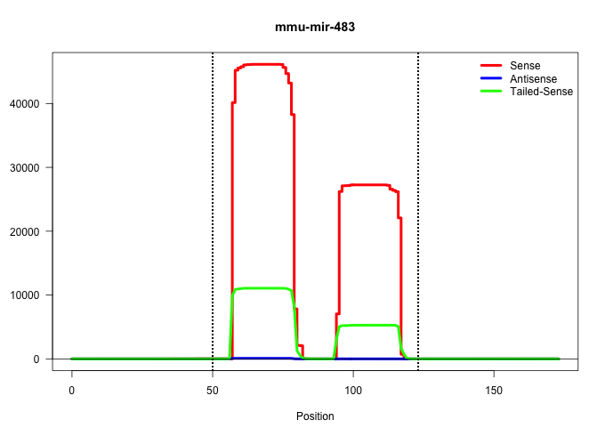 | GGGGCTTCACAGATAGGAGGGCCCCAAGCCCAACCTCGGACCGTGGGGGAGAGGGGGAAGACGGGAGAAGAGAAGGGAGTGGTTTTTGGGTGCCTCACTCCTCCCCTCCCGTCTTGTTCTCTCCTGCCCTATCTTCCCTTCCTGTCACAGTTCAGCGATGGGGGTTGGGGGTG ..................................................(((((((((((((((((.......(((((..((....((....)).))..))))))))))))))).))))))).................................................. ..................................................51......................................................................123................................................ | Size | Perfect hit | Total Norm | Perfect Norm | SRR040489(GSM533912) E18.5 Ago2 catalytically inactive LIVER small RNA. (liver) | SRR040488(GSM533911) E18.5 wild type LIVER small RNA. (liver) | SRR039186(GSM485326) shLuc.1309;ROSA-rtTA (+dox). (fibroblast) | SRR039185(GSM485325) shLuc.1309;ROSA-rtTA (-dox). (fibroblast) | SRR391848(GSM852143) gender: femalegenotype/variation: wild typeti. (embryo) | SRR039183(GSM485323) shLuc.1309 (-dox). (fibroblast) | mjLiverWT1() Liver Data. (liver) | SRR391851(GSM852146) gender: femalegenotype/variation: wild typeti. (embryo) | Ago2IP517(Rui) Quantitative functions of Argonaute proteins . (ago2 skin) | SRR391845(GSM852140) gender: femalegenotype/variation: wild typeti. (embryo) | SRR391847(GSM852142) gender: femalegenotype/variation: ADAR2-/-/AD. (embryo) | SRR039184(GSM485324) shLuc.1309 (+dox). (fibroblast) | SRR391852(GSM852147) gender: femalegenotype/variation: ADAR2-/-tis. (embryo) | SRR059774(GSM562836) MEF_control. (MEF) | SRR391853(GSM852148) gender: femalegenotype/variation: ADAR2-/-/AD. (embryo) | SRR391846(GSM852141) gender: femalegenotype/variation: ADAR2-/-tis. (embryo) | SRR059776(GSM562838) MEF_Dicer. (MEF) | Ago1IP517(Rui) Quantitative functions of Argonaute proteins . (ago1 skin) | mjLiverKO2() Liver Data. (Zcchc11 liver) | SRR042475(GSM539867) mouse embryonic fibroblast cells [09-002]. (fibroblast) | GSM510456(GSM510456) newborn_rep12. (total RNA) | mjLiverWT3() Liver Data. (liver) | SRR029043(GSM433295) 18.5dpc_homo_tdrd1-KO. (tdrd1 testes) | Ago1IP812(Rui) Quantitative functions of Argonaute proteins . (ago1 skin) | mjLiverKO3() Liver Data. (Zcchc11 liver) | Ago2IP504(Rui) Quantitative functions of Argonaute proteins . (ago2 skin) | Ago3IP812(Rui) Quantitative functions of Argonaute proteins . (ago3 skin) | mjLiverKO1() Liver Data. (Zcchc11 liver) | SRR279907(GSM689057) cell type: mouse embryonic stem cellcell line. (ESC) | SRR029042(GSM433294) 18.5dpc_hetero_tdrd1-KO. (tdrd1 testes) | SRR391850(GSM852145) gender: femalegenotype/variation: ADAR2-/-/AD. (embryo) | SRR037914(GSM510451) newborn_rep7. (total RNA) | SRR391849(GSM852144) gender: femalegenotype/variation: ADAR2-/-tis. (embryo) | Ago3IP805(Rui) Quantitative functions of Argonaute proteins . (ago3 skin) | SRR037912(GSM510449) newborn_rep5. (total RNA) | mjTestesWT1() Testes Data. (testes) | GSM510454(GSM510454) newborn_rep10. (total RNA) | GSM510453(GSM510453) newborn_rep9. (total RNA) | GSM510452(GSM510452) newborn_rep8. (total RNA) | GSM510455(GSM510455) newborn_rep11. (total RNA) | GSM510450(GSM510450) newborn_rep6. (total RNA) | mjTestesWT3() Testes Data. (testes) | SRR042483(GSM539875) mouse muscle tissue [09-002]. (muscle) | SRR037921(GSM510459) e12p5_rep3. (embryo) | mjTestesWT4() Testes Data. (testes) | SRR037920(GSM510458) e12p5_rep2. (embryo) | SRR059775(GSM562837) MEF_Drosha. (MEF) | SRR060845(GSM561991) total RNA. (brain) | GSM640579(GSM640579) small RNA in the liver with paternal Low pro. (liver) | GSM640578(GSM640578) small RNA in the liver with paternal control. (liver) | GSM640581(GSM640581) small RNA in the liver with paternal control. (liver) | GSM640580(GSM640580) small RNA in the liver with paternal Low pro. (liver) | SRR014230(GSM319954) 10 dpp Dnmt3L-KO MILI. (mili testes) | SRR037910(GSM510447) newborn_rep3. (total RNA) | SRR037909(GSM510446) newborn_rep2. (total RNA) | SRR390297(GSM849855) cell line: NIH-3T3cell type: fibroblastip ant. (fibroblast) | SRR248525(GSM733813) cell type: Thy1- spermatogonial stem cellstra. (testes) | SRR014229(GSM319953) 10 dpp MILI. (mili testes) | SRR042477(GSM539869) mouse brain tissue [09-002]. (brain) | SRR390300(GSM849858) cell line: NIH-3T3cell type: fibroblastinfect. (ago2 fibroblast) | SRR248527(GSM733815) cell type: spermatogonial stem cell enriched . (testes) | SRR390299(GSM849857) cell line: NIH-3T3cell type: fibroblastip ant. (ago2 fibroblast) | SRR248526(GSM733814) cell type: Thy1- spermatogonial stem cellstra. (testes) | SRR029123(GSM416611) NIH3T3. (cell line) | SRR014232(GSM319956) 16.5 dpc MILI. (mili testes) | SRR248524(GSM733812) cell type: Thy1+ spermatogonial stem cellstra. (testes) | SRR029037(GSM433289) 18dpp_homo_tdrd6-KO. (tdrd6 testes) | SRR037922(GSM510460) e12p5_rep4. (embryo) | SRR248523(GSM733811) cell type: Thy1+ spermatogonial stem cellstra. (testes) | SRR069809(GSM610965) small RNA sequencing; sample 1. (testes) | SRR014231(GSM319955) 16.5 dpc total. (testes) | mjTestesKO8() Testes Data. (Zcchc11 testes) | SRR306540(GSM750583) 19-24nt. (ago2 brain) | SRR037911(GSM510448) newborn_rep4. (total RNA) | SRR038742(GSM527277) small RNA-Seq. (dgcr8 brain) | GSM317183(GSM317183) Ago-1 IP small RNAs from mouse brain. (ago1 brain) | SRR029036(GSM433288) 18dpp_hetero_tdrd6-KO. (tdrd6 testes) | SRR037919(GSM510457) e12p5_rep1. (embryo) | RuiDGCR8WT(Rui) DGCR8-dependent microRNA biogenesis is essent. (skin) | RuiDcrWT(Rui) DGCR8-dependent microRNA biogenesis is essent. (skin) | SRR073955(GSM629281) total RNA. (blood) | SRR023848(GSM307157) mEFsmallrna_rep1. (cell line) | SRR032477(GSM485235) sRNA_activation_deep_sequencing. (uterus) | mjTestesKO6() Testes Data. (Zcchc11 testes) | SRR042484(GSM539876) mouse salivary gland tissue [09-002]. (gland) | GSM510444(GSM510444) brain_rep5. (brain) | SRR073954(GSM629280) total RNA. (blood) | SRR029038(GSM433290) 25dpp_hetero_tdrd6-KO. (tdrd6 testes) | GSM317184(GSM317184) TRIM32 IP small RNAs from mouse brain. (trim32 brain) | SRR037925(GSM510463