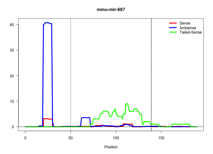 | TTTATACCTCTAAATTCTTCTCCCACAGATGCTATCATGGTAAAACACACATAGTCTGACACACATTTTACACTATCCTGGAATGCAGCAATGAATCCTGGGTTATTGTTTCAGTCTGTCATTGTATTCTTGGAAAGTGATACAAACCAGTTTAGTTTGCATTATATATTTGGAGTTATTTTCTAAATT ......................................................................((((.(((.((((((((...((((...(((((.......)))))....)))))))))))).))).)))).................................................. ..................................................51......................................................................................139................................................ | Size | Perfect hit | Total Norm | Perfect Norm | mjTestesWT1() Testes Data. (testes) | SRR040489(GSM533912) E18.5 Ago2 catalytically inactive LIVER small RNA. (liver) | SRR029039(GSM433291) 25dpp_homo_tdrd6-KO. (tdrd6 testes) | mjTestesKO8() Testes Data. (Zcchc11 testes) | GSM314552(GSM314552) ESC wild type (Illumina). (ESC) | SRR345201(SRX097262) source: size fractionated RNA from mouse hipp. (brain) | SRR345196(SRX097257) source: size fractionated RNA from mouse hipp. (brain) |