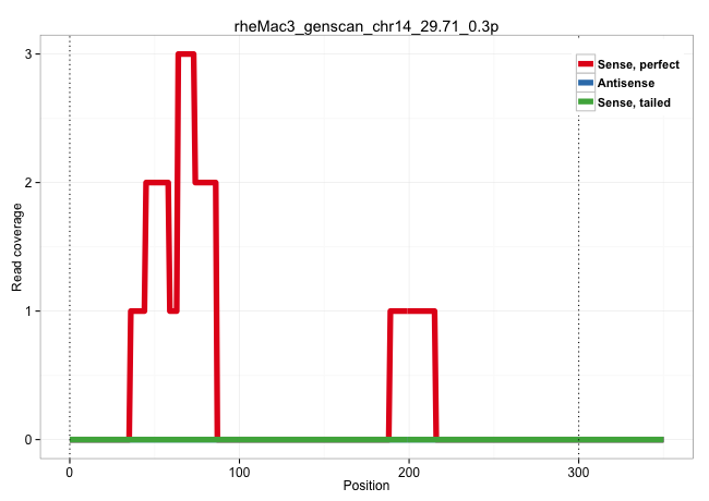 | ATGAACTTTGTATGTCCTTAGCCTCTGCCGGGAACAGAGTGTTCATATGCTGTTAGAATTTTTTATTGTAAAATAAAATGACAAAGGCTTTCATACCCCAAAACCTGCCTGTTTCTCATTCTACCTCCTCCAGATGGTGAGATGGAATCCCTTTCACAAGCCAGCCACAAAACAGTGCCTGTTGGGGGTTGCTAAAGAACCATTCCAGTCCTGGAGGACCCAGTGTGGTCTCAGGAGCCATCCCAGCTTGGGTGATGAGCTCAGGGGCCAAAAAAAATGCTCACCCCTGGCCATCCACAGGCCCCAGAGAAGCAGTTTCAGCCTACCCATGACTTAGCAGCTAAAGAAAG | Size | Perfect hit | Total Norm | Perfect Norm | SRR553605(SRX182811) source: Frontal Cortex. (Frontal Cortex) | SRR553581(SRX182787) source: Testis. (testes) |