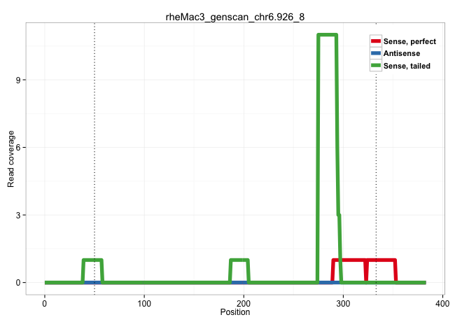 | CCAGGGAATTTCTTGTGTCTCAAAAACTTCCAGAGCACACCAAAGGAGAAGTCTAAATGCGACCATAGCATGAGACCCTCAGGGCCTCAGTGTGGATGGCCCTTGCCAGAGAAGATGTCAAGACTCAGCATGCAGCGCTTGCTTGGCCCCGCCACATCCTGCCTGGGTTAAAGTCTCCCCTGCCCTTGAGCTGCCAGTTGAACTTGGTCGGCACAGGTGTGACCTTGTGCTGGGAAGAAGGGATGGTGATAAGCCCAAGTTTTGGAAAGGAACAGCAATCTCTTTTCTTTTGTTCAGATACCAAGCTCTCACAGAAGCTGTGCCTCCTGACAGATTGGCTTTGGAGGAAGGGCCCAGGTTCTGAGCCCAAAGGACCCCCAAGG .........................................................................................................................................................................................((((((.(((((......)))))(((((((((......))))))))).((((((((((.(((.....)))...(((((.....))))).......)))))))))).))))))...................................................................................... ......................................................................................................................................................................................183................................................................................................................298................................................................................... | Size | Perfect hit | Total Norm | Perfect Norm | SRR553577(SRX182783) source: Frontal Cortex. (Frontal Cortex) | SRR553578(SRX182784) source: Cerebellum. (Cerebellum) | SRR553605(SRX182811) source: Frontal Cortex. (Frontal Cortex) | SRR553581(SRX182787) source: Testis. (testes) |