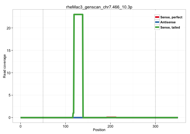 | GGAATACAGTGGTGCAATCTTGGCTCACTGCAACCTCAAAGGCCTAGACTCAAGCGATTCTCCCGCCTCACCCTCCTCAGTAGCTGGGACTACAGGCACGCACCAGCACGCCCACTAATTAAAAATTTTTTTTTTTTTTTTTTTTTTTTTTTTTTTTTAAGTAGAGAAGAGGTTTCGTCATGTTGGTCAGACTGGACTCGAGTGATCCTCCTGCCTCAGCCTCCCAAAGTGTTGGGATTACAGTCCTGAGCCACCGCGCCAGGCCCGGATCCCCTTTTAGAAGGGTTGGTTTTCCCTCAGGTCTTGGCTATCAGCGCTCCCCTCTTAGGGGTTCCACCTCCTACTCCCCA ..................................................................................................................(((.(((((((............................))))))).)))....(((((...(((((...((((......))))...)))))......)))))..................................................................................................................................... ..................................................................................................................115...................................................................................................217................................................................................................................................... | Size | Perfect hit | Total Norm | Perfect Norm | SRR553577(SRX182783) source: Frontal Cortex. (Frontal Cortex) | SRR553578(SRX182784) source: Cerebellum. (Cerebellum) | SRR553579(SRX182785) source: Heart. (Heart) | SRR553581(SRX182787) source: Testis. (testes) |
