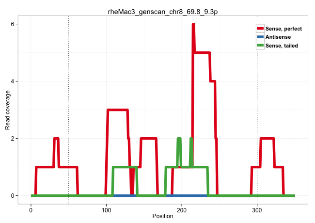 | TTAGGTGTATAAGGAGAAAAGTTGACACATCTGGGACCTCTGACATGTGTACACATGCTTGCACACATGCACACACACTGAATGTTTTAAGTTATACAAACATAAGACCTTAAGATGAAAAGAGCCAGAATATTCTAAAGAGGTGATGAACAAAGGGGATGGAAACTGCATCACAGATGTTTTCCAAGGGCCAGGGTGGAATTTGAGCTCTAGTGTCTGACTTTGAGATGTGTTGTATTTTTAACACATAAATGAGGGGATCCATATCACATTCTTTCTTGTGGACCACCAAATTGAAAGCTTTCTTGTAACTCACAAGCAGCAGCTCTCCAGCAGCTCTCCATAGCCTG ..............................................................................................................................................................................(((..((.....(((((((((......)))).)))))))..))).................................................................................................................................... ..............................................................................................................................................................................175................................................................242.......................................................................................................... | Size | Perfect hit | Total Norm | Perfect Norm | SRR553581(SRX182787) source: Testis. (testes) | SRR553607(SRX182813) source: Testis. (testes) | SRR553579(SRX182785) source: Heart. (Heart) | SRR553577(SRX182783) source: Frontal Cortex. (Frontal Cortex) |