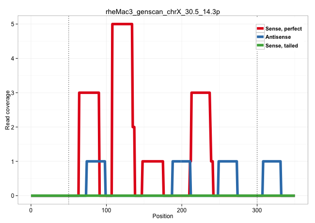 | CCCACCAACAGTGGCCATGCGTGTCATATCTGTGTCCTTTTAGTAACCACAAGTCAGAGTCTGATCTGACTTGTGCATAGGAGTCCTTGGCCTTTGTTAATTTTCCTCTAGTACAACATCTGGCACTAGAATGGCAGCATATATATGAGTGGGTGTATCGGTCTTGTCATATCTGCACCCCCATGGTAGTCTTGTCAGCCCAACTCAGTGTTCTGGACATCTGAAGTCACACAGTGACTGGCAGCCCTGGCTTCGCGGTTCCCTGTGGCCTCCTAGAGTTTCCTTGCTCCTGCTCCTCAGGGCCCAGAGCACCTCTGTGGCAGGTTCCCACAGCGCCAGCCCAGGTTCCA ............................................................................................................................................................................................................((((((((...)))).)))).(((((...))))).((.(((...(((..(((((....)))))))).....((((......))))..)))))...................................................... ........................................................................................................................................................................................................201................................................................................................300................................................ | Size | Perfect hit | Total Norm | Perfect Norm | SRR553581(SRX182787) source: Testis. (testes) | SRR553607(SRX182813) source: Testis. (testes) |